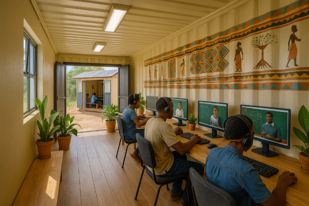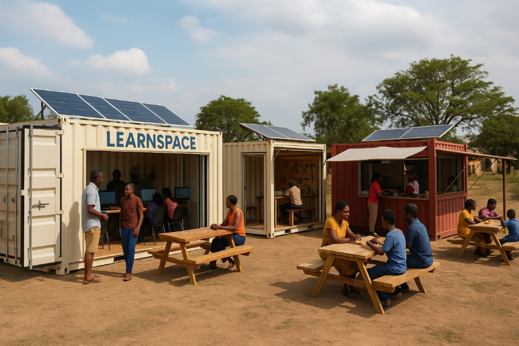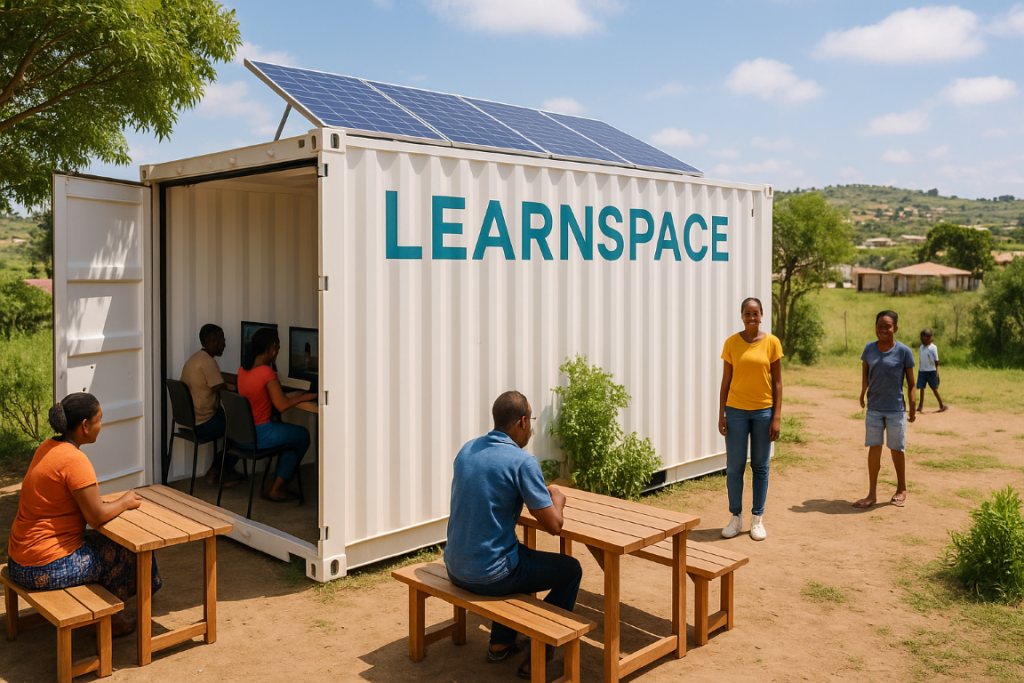 LearnSpace Labs are self-contained, solar-powered learning hubs housed in fitted-out shipping containers — designed to be dropped into any community, anywhere. Each lab creates a space where people can skill themselves using quality online content, without needing money to access it.